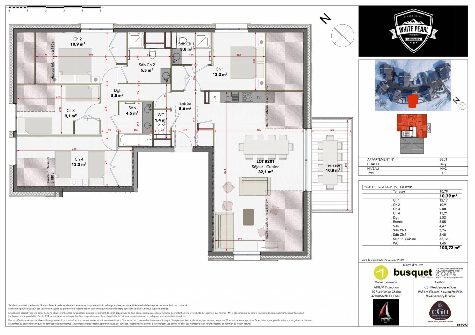 Nous avons selectionné pour vous un appartement T5 chalet B d'une superficie de 103,72m2 et d'un balcon de 10,79m2 avec une vue Sud est.