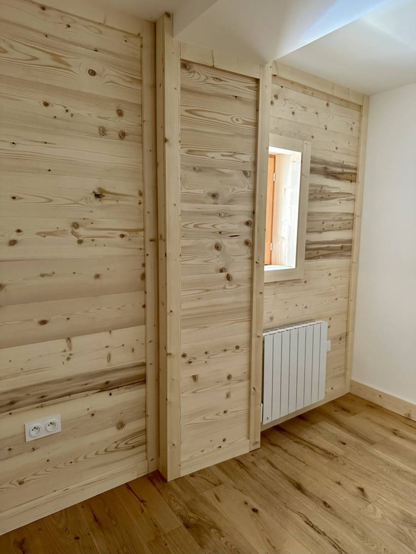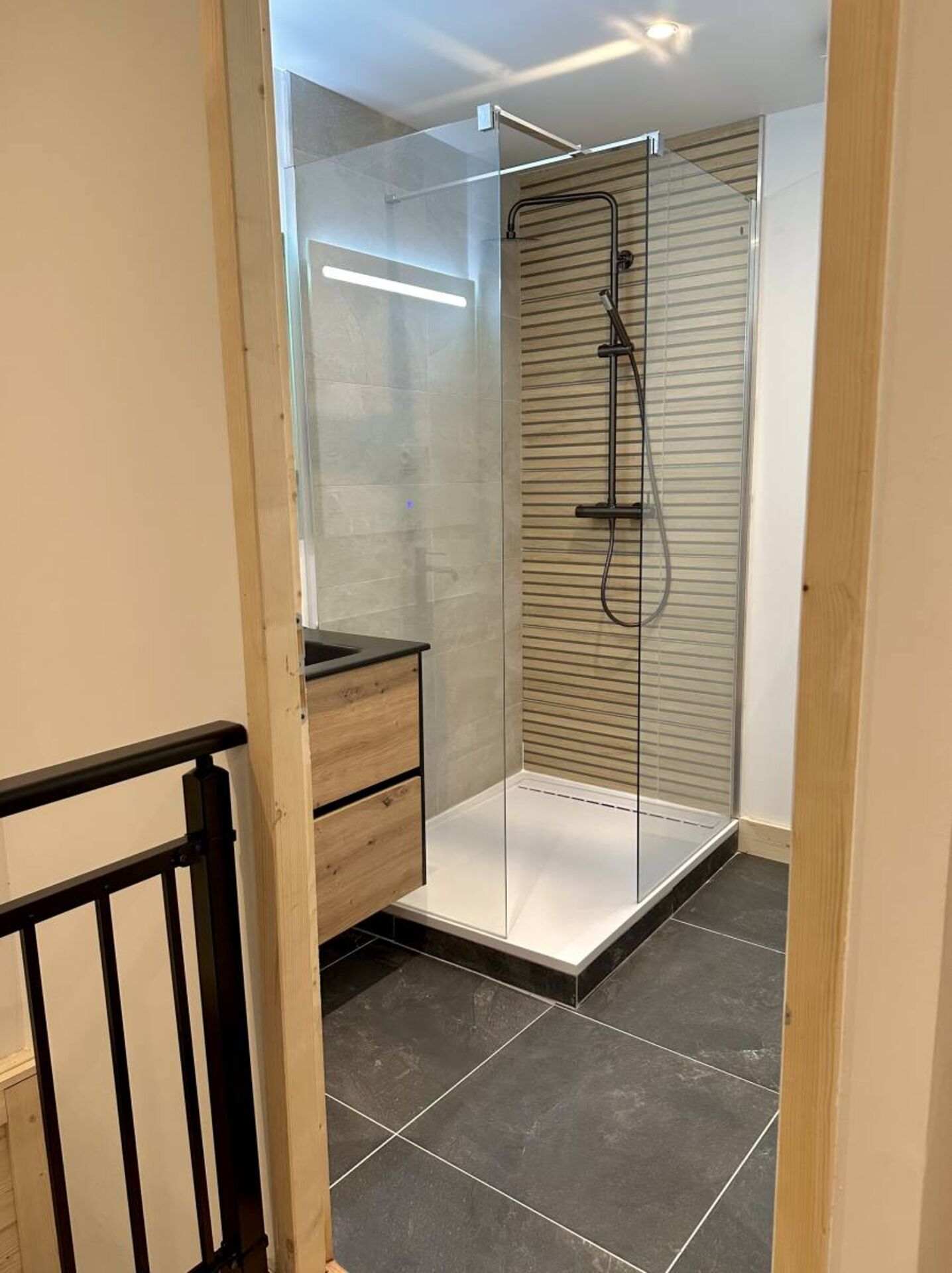 Matériaux haut de gamme (bois massif, carrelage contemporain), casier à skis, parking privatif.