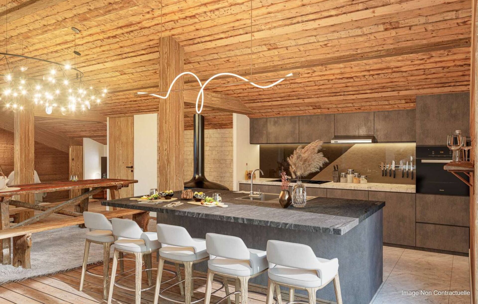 Un vaste espace de vie lumineux comprenant un séjour avec salon et salle à manger, ainsi qu'une cuisine ouverte équipée, pensé pour le confort et la convivialité.